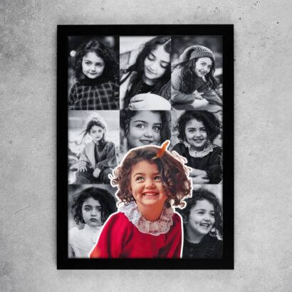 Bring joy to your space with this black & white collage of cute childhood moments, highlighted by a vibrant central portrait. A heartwarming gift for birthdays or as nursery room décor.